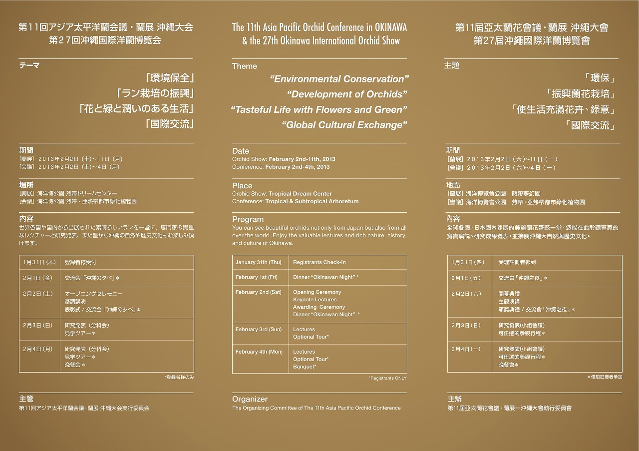 The 11th APOC is organized by the Okinawa International Orchid Show Executive Committee in cooperation of Okinawa General Affairs Bureau, Okinawa Prefecture, and Ocean Exposition Commemorative Park Management Foundation.